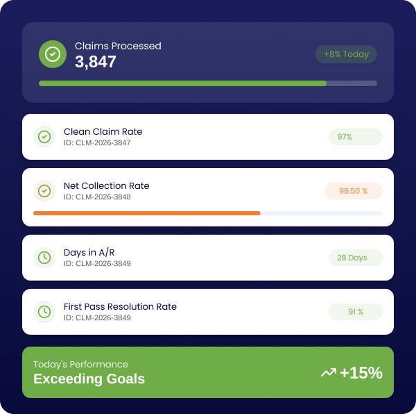 Our proprietary technology platform provides real-time visibility into your revenue cycle performance. Advanced analytics help identify trends and opportunities, while automated workflows reduce manual errors and improve efficiency. Our platform integrates with over 50 EHR and practice management systems, ensuring seamless data flow and improved charge capture.